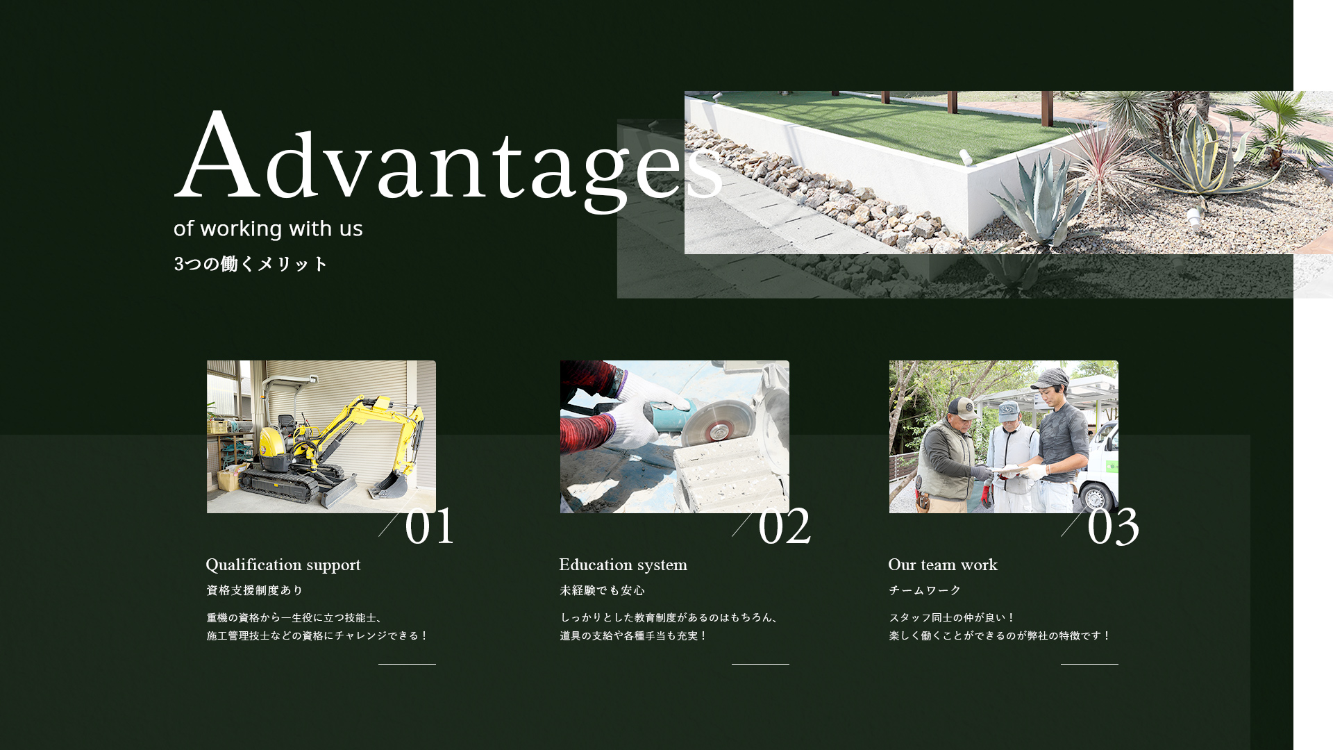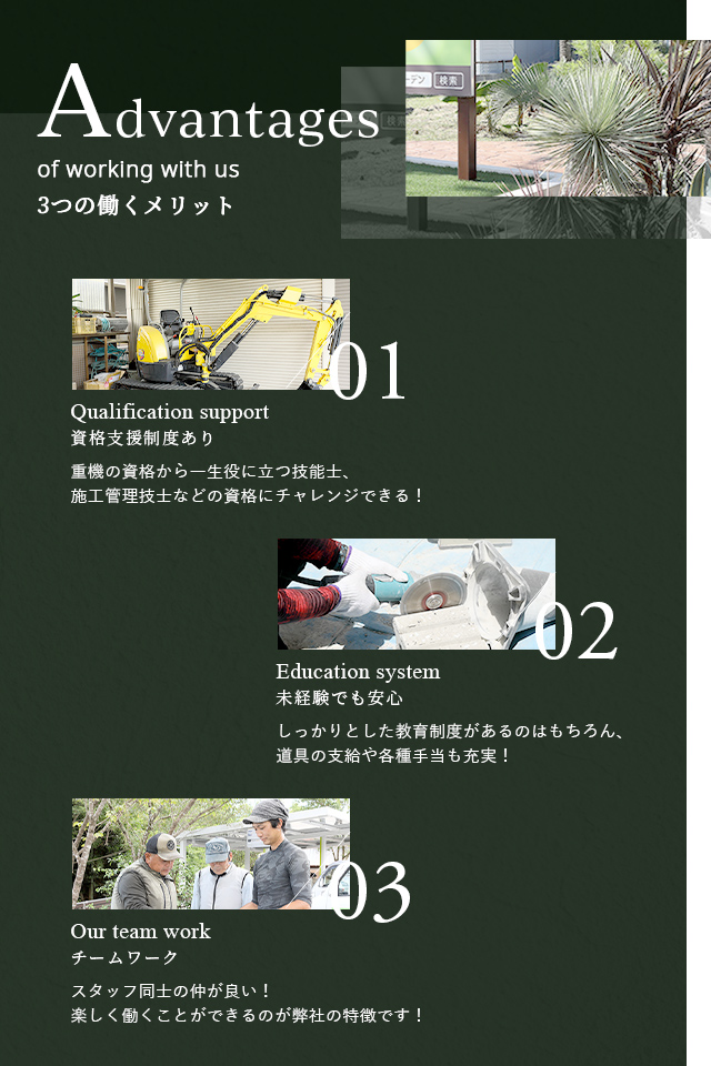 効率良く成長できるような教育カリキュラム、様々な資格の取得への挑戦、現場での実践を積み一人前の職人を目指していただきます。
